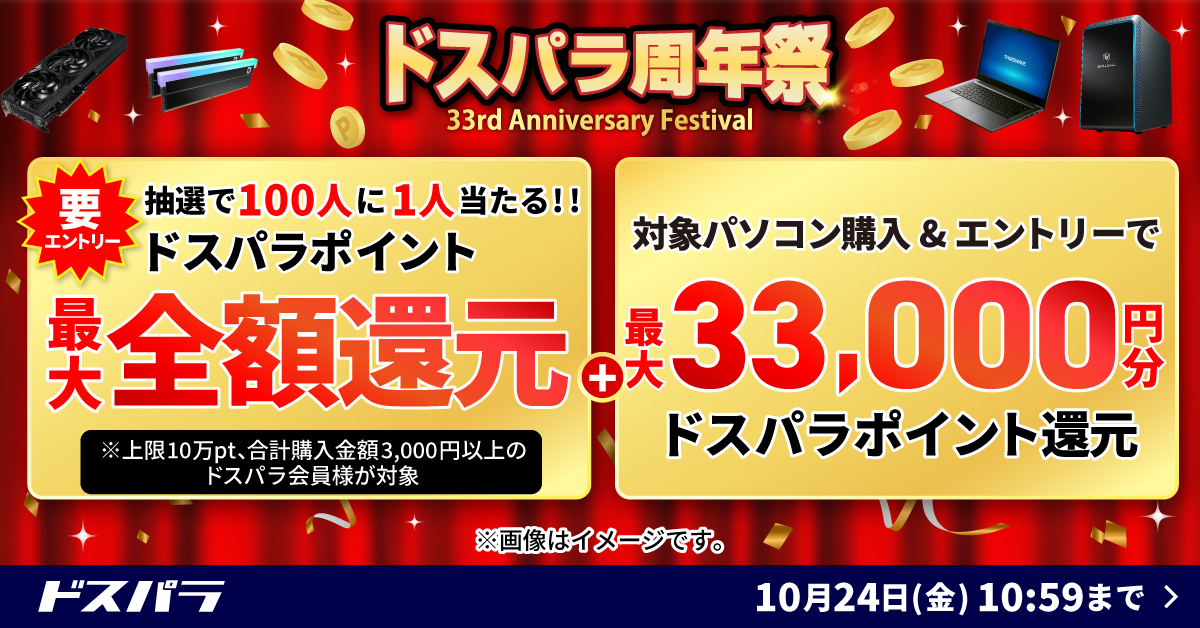 ■『ドスパラ周年祭 対象PCのご購入&エントリーで最大33,000円分のドスパラポイント還元』