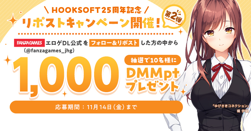 株式会社デジタルコマース(東京都港区、代表取締役社長 島崎 啓之)が展開するFANZA GAMESは、2025年10月24日(金)12:00から2025年11月14日(金)16:59まで、人気美少女ゲームブランド『HOOKSOFT』の25周年を記念したブランド合同キャンペーン第2弾を開催いたします。