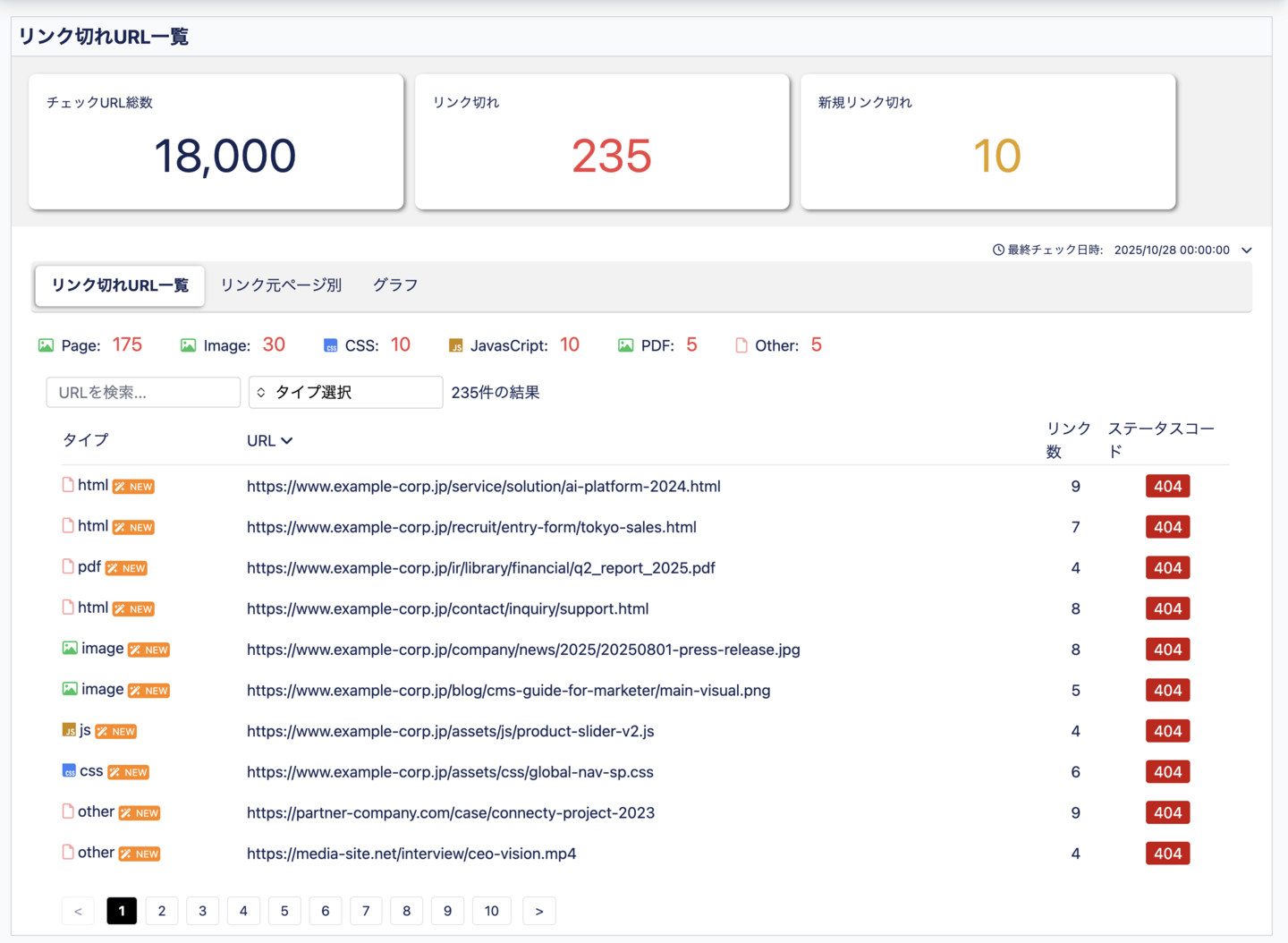 Webサイトのリンク切れ(404エラー)を自動で検知・通知し、サイトの信頼性を維持します。本機能により、管理者はダッシュボードでサイト全体のURL数、404エラー数、新規発生エラー数を即座に把握できます。また、チェック対象は内部リンクに加え、一次の外部リンクにも及ぶため、外部環境の変化にも対応可能です。さらに、リンク切れURLとその参照元ページを特定できるため、修正作業を効率化します。