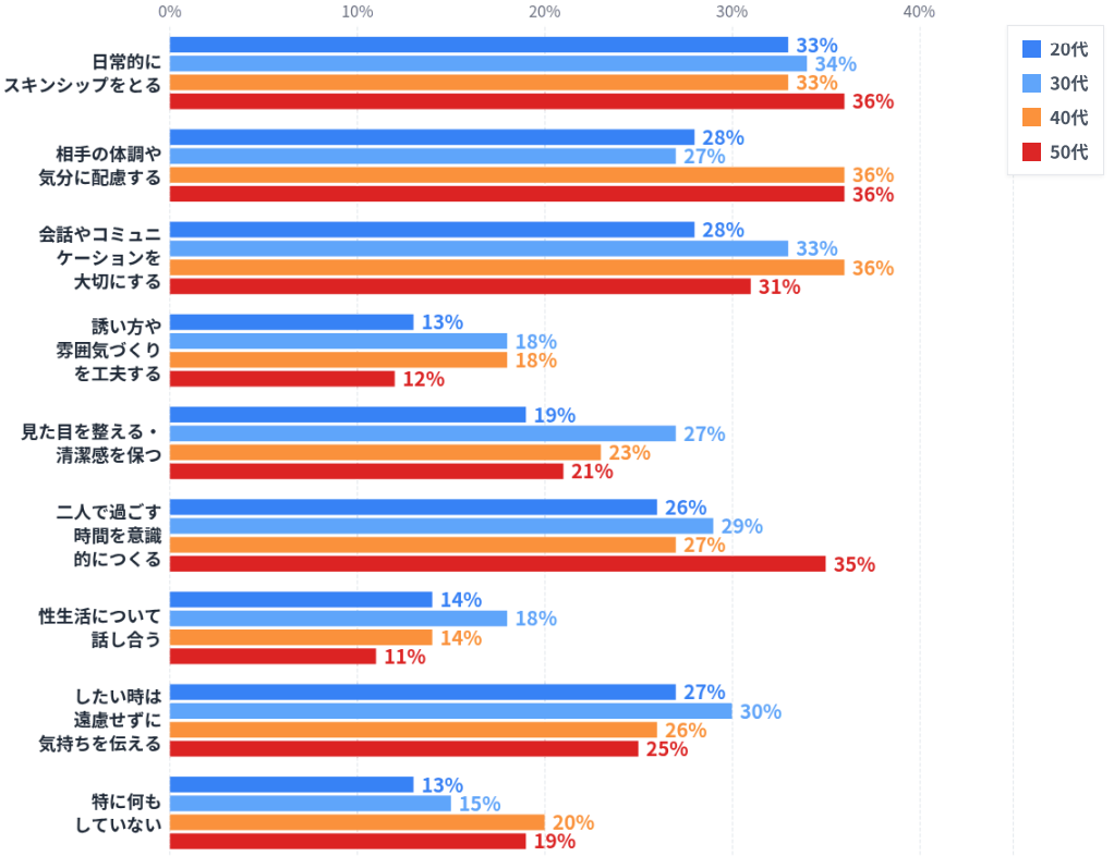 また、いずれの年代でも「特に何もしていない」と回答する人が一定数存在しており、セックスレス“じゃない”状態が、必ずしも明確な工夫や対策の結果として自覚されているわけではない点も共通しています。