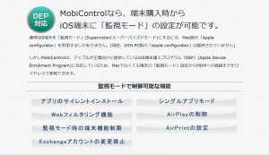 また、今回リリースする新バージョンではApple社が提供する「DEP」(Apple Device Enrollment Program)に対応した製品となっていますので、iOS端末の管理/運用を考えられているお客様にとって端末登録手続きや運用への負担が大幅に低減されます。