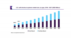 セルフチェックアウトシステムの市場規模、2019年に28億米ドル到達、2020年から2027年はCAGR13.3%で成長予測