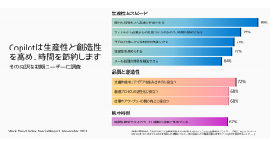 米国時間2023年11月15日、マイクロソフトは、Copilot for Microsoft 365 https://news.microsoft.com/ja-jp/2023/03/17/230317-introducing-microsoft-365-copilot-your-copilot-for-work/ などの生成AIを活用したサービスが、人々の働き方をどのように変革できるのかを調査したレポートを公開しました。ここでは、初めて実施した、職場でのCopilotに関する調査結果をまとめたレポートの概要をご紹介します。