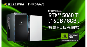 圧倒的パフォーマンスと安定性を誇るPC GALLERIA(ガレリア)は、NVIDIA製グラフィックボードの最新世代である「GeForce RTX(TM) 50シリーズ」から「GeForce RTX(TM) 5060Ti」搭載PCを、全国のコンピューターショップ ドスパラ各店舗、およびドスパラ通販サイトにて2025年4月16日(水)22時より、販売開始しました。 [資料: https://files.value-press.com/czMjYXJ0aWNsZSM0MjE4MSMzNTQ0NjIjNDIxODFfdXZBQXlQcENHTS5qcGc.jpg ] 圧倒的パフォーマンスと安定性を誇るPC GALLERIA(ガレリア)(株式会社サードウェーブ 東京都千代田区 取締役社長 永井正樹)は、NVIDIA製グラフィックボードの最新世代である「GeForce RTX(TM) 50シリーズ」から「GeForce RTX(TM) 5060Ti」搭載PCを、全国のコンピューターショップ ドスパラ各店舗、およびドスパラ通販サイトにて2025年4月16日(水)22時より、販売開始しました。 [資料: https://files.value-press.com/czMjYXJ0aWNsZSM0MjE4MSMzNTQ0NjIjNDIxODFfWENxSlFVaVNXby5qcGc.jpg ] 「GeForce RTX(TM) 50シリーズ」は、NVIDIA Blackwell アーキテクチャを搭載しAI性能が格段に変化。AIの性能指標であるAI TOPSは、前作の同グレードモデルに比べ、「GeForce RTX(TM) 5060Ti」は約2.2倍もの向上を果たしています。またフルレイトレーシングゲームにおけるDLSS4の活用で、前世代に比べ2倍のフレームレートと、レイテンシ(プレイヤーの操作が画面に反映されるまでのラグ)の低減を実現しました。 今回は、『GALLERIA』とTHIRDWAVEブランドの『Lightning-G』からそれぞれ「GeForce RTX(TM) 5060Ti」8GB・16GB搭載の計4製品をラインアップ。用途やデザインに合わせてご検討ください。 ぜひ、この機会に、「GeForce RTX(TM) 5060Ti」搭載PCをお求めください。 ◆発売製品 ●GALLERIA XA7R-R56T 7800X3D/RTX5060Ti 16GB搭載 (AMD Ryzen 7 7800X3D / GeForce RTX 5060Ti 16GB / 32GB DDR5 / 1TB Gen4 NVMe SSD) 289,980円(税込) https://www.dospara.co.jp/TC30/MC17927.html ●GALLERIA XA7C-R56T Intel Core Ultra搭載 (インテル Core Ultra 7 265F / GeForce RTX 5060Ti 8GB / 32GB DDR5 / 1TB Gen4 NVMe SSD) 249,980円(税込) https://www.dospara.co.jp/TC30/MC17940.html ●Lightning-G AV-Ti7XW Ryzen7 5700X/RTX5060Ti 16GB搭載 (AMD Ryzen 7 5700X / GeForce RTX 5060 Ti 16GB / 16GB / 500GB Gen4 NVMe SSD) 189,979円(税込) https://www.dospara.co.jp/TC50/MC18009.html ●Lightning-G AV-Ti7XW Ryzen7 5700X/RTX5060Ti 8GB搭載 (AMD Ryzen 7 5700X / GeForce RTX 5060 Ti 8GB/ 16GB / 500GB Gen4 NVMe SSD) 179,980円(税込) https://www.dospara.co.jp/TC50/MC18010.html ※2025年4月16日(水) 時点の価格です。価格は随時変更されます。 ◆GeForce RTX 50 シリーズの特長 NVIDIA Blackwell を搭載した GeForce RTX(TM) 50 シリーズ GPU は、ゲーマーとクリエイターに革新的な変化をもたらします。大規模な AI を備えた GeForce RTX(TM) 50 シリーズは、新しい体験と前例のないようなグラフィックスを実現。NVIDIA DLSS 4 で性能を飛躍させ、かつてないスピードで画像を生成し、NVIDIA Studio を使用することでさらに創造力を加速させます。 詳細は、製品紹介ページよりご確認ください。 https://www.dospara.co.jp/contents/geforce-rtx-50.html ◆おすすめ製品スペック [資料: https://files.value-press.com/czMjYXJ0aWNsZSM0MjE4MSMzNTQ0NjIjNDIxODFfa3lEbmJNVFdVZC5wbmc.png ] [資料: https://files.value-press.com/czMjYXJ0aWNsZSM0MjE4MSMzNTQ0NjIjMzU0NDYyXzg3NDFkM2YyZmQ1NTA5ZTVmZjY0MzIxMmM4YTM1MDk4LnBuZw.png ] [資料: https://files.value-press.com/czMjYXJ0aWNsZSM0MjE4MSMzNTQ0NjIjMzU0NDYyXzNmMjEwOWJhMjhmYWMxYzlhNmJhMTk2NGQzMTI4ZjMwLnBuZw.png ] 【GALLERIAについて】 『GALLERIA(ガレリア)』シリーズは最新のPCゲームやクリエイティブ制作を楽しみたい方の為に、どこまでも高性能を追求するハイパフォーマンスPCのブランドです。ゲームプレイや創作活動に対しての安定した環境をご提供するため、製品のクオリティに徹底的にこだわり、開発から生産、アフターサービスまで、すべてのステージでそのこだわりを貫きます。 ブランドサイト https://galleria.net ゲーミングPC販売ページ https://www.dospara.co.jp/gamepc クリエイターPC販売ページ https://www.dospara.co.jp/create 【株式会社サードウェーブについて】 株式会社サードウェーブは、個人のお客様からプロユース、法人のお客様の課題解決のためのソリューションビジネスを行うIT企業です。パソコン専門店『ドスパラ』の運営をはじめ、PCブランド『GALLERIA』、『raytrek』、『THIRDWAVE』などの企画・製造、及び当社だけのアフターフォローやサポートサービスを展開。さらに、高校生のためのeスポーツ大会『NASEF JAPAN 全日本高校eスポーツ選手権』に特別協賛しています。また、各地方自治体に対し、eスポーツのための支援を行っています。サードウェーブは最先端の技術を安心と共にお届けすることで、より良い情報化社会の実現に貢献し、100年先も世の中に求められる企業であることを目指します。 サードウェーブ https://info.twave.co.jp/ ドスパラ https://www.dospara.co.jp/ ※本リリースに記載の内容は予告なく変更となる場合があります。予めご了承ください。 [資料: https://files.value-press.com/czMjYXJ0aWNsZSM0MjE4MSMzNTQ0NjIjMzU0NDYyXzFkMzhlMmFkMjAyNWIwYjViMGFmNDUzMGYyZTkxNzZhLnBuZw.png ]