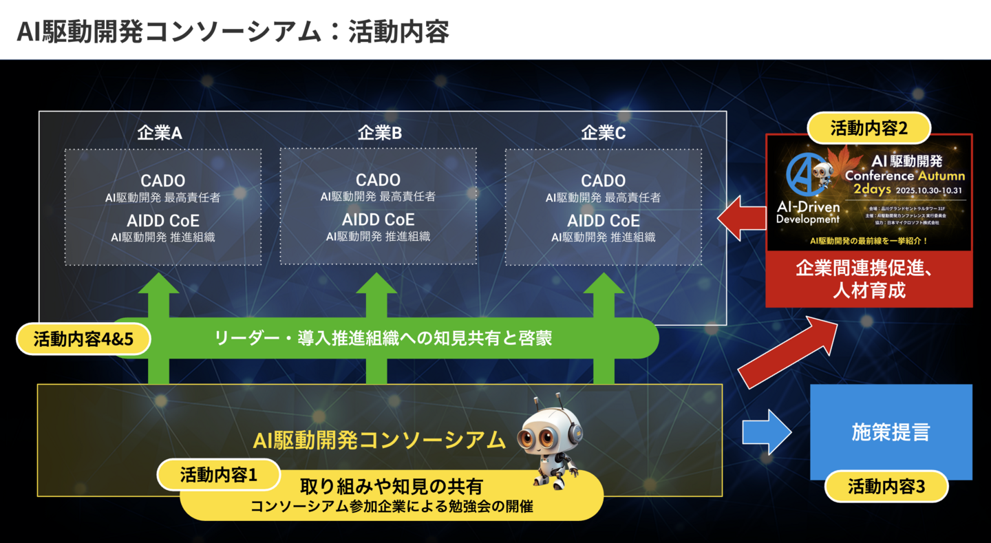 AI駆動開発コンソーシアムは、企業の枠を越えて「AI駆動開発」の啓蒙と知見共有を行い、日本企業全体の競争力強化とイノベーション創出に貢献することを目的としています。