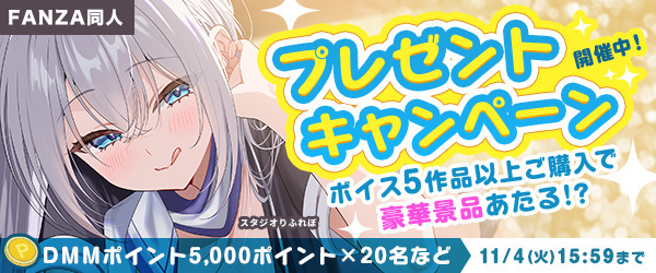 ・応募条件:キャンペーン期間中に特設ページの【キャンペーンに応募する】ボタンから応募し、FANZA同人にてボイス作品を5作品以上購入した方が対象となります。