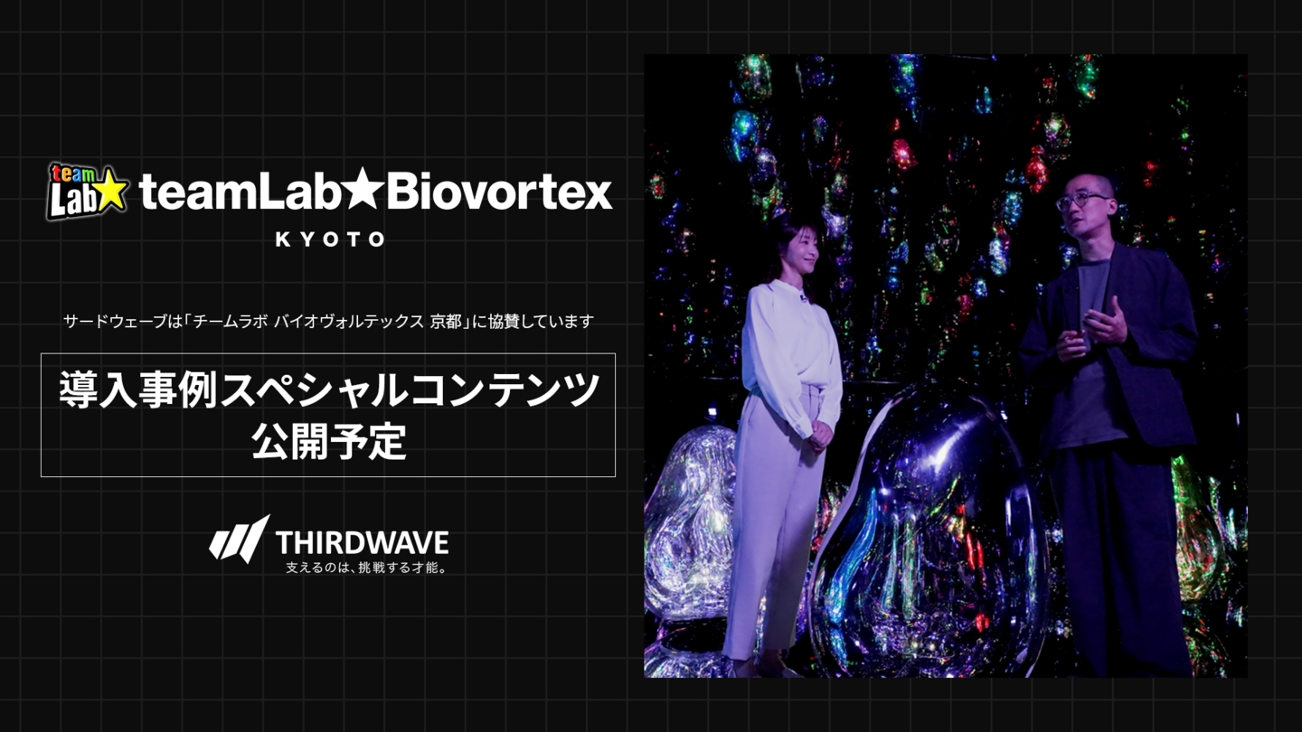 さらにサードウェーブでは、本協賛をもとに「チームラボ バイオヴォルテックス 京都」における導入事例スペシャルコンテンツを制作しています。内容は以下の3本立てで、映像と記事を通じてアートミュージアムの魅力とテクノロジーの役割を多角的に紹介します。