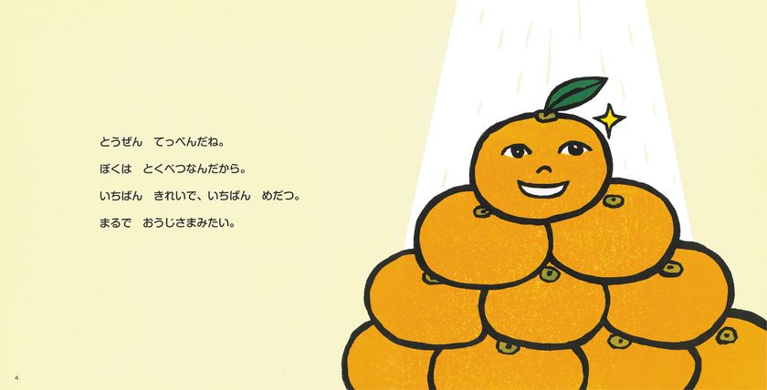 たくさんのみかんの中で、ぼくだけ、りっぱな葉っぱがついているんだ。どうだい、すてきでしょ?