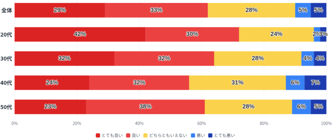 年代別では、20代では「とても良い」が42%と高い割合を占めていますが、