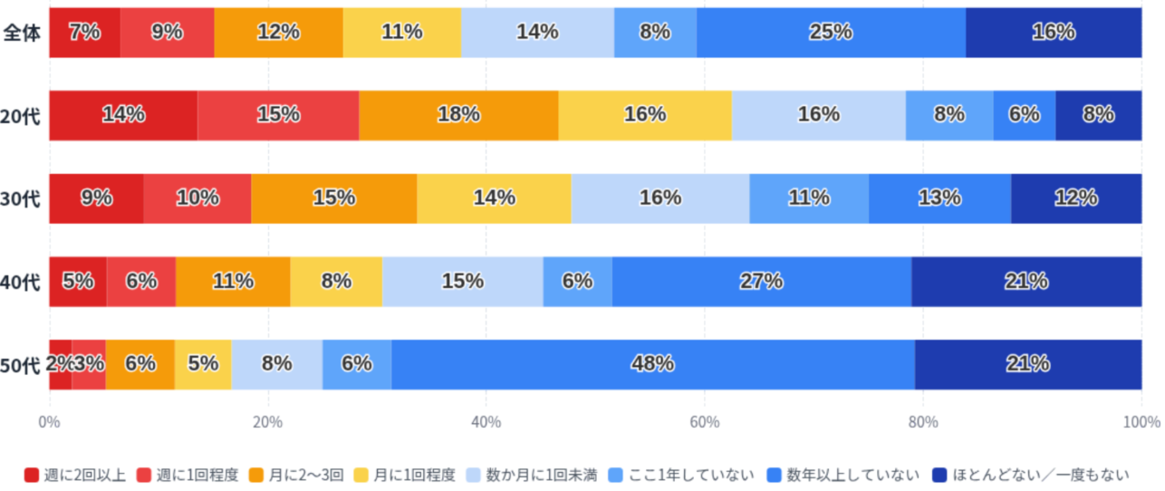 年代別に見ると、20代では「週1回以上」の割合が29%と比較的高い一方、年齢が上がるにつれてその頻度は徐々に低下していきます。