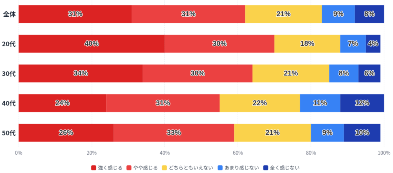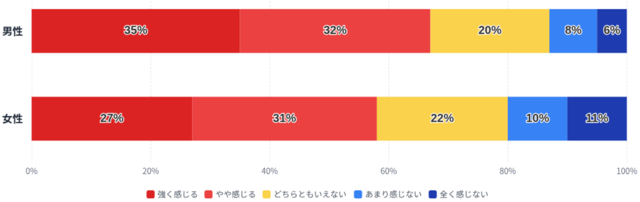 また、性別で見ると、「強く感じる」と回答した割合は男性が35%、女性が27%と差があり、一方で「全く感じない」は女性が11%と、男性(6%)を上回っています。