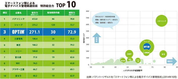 ビジネス向けスマートフォンアプリ、タブレットアプリのマーケットリーダーである株式会社オプティム(証券コード:3694、以下 オプティム)は、株式会社パテント・リザルト※1が発表した「スマートフォン等による電子デバイス管理技術、特許総合ランキング」で第3位※2となりました。(株式会社オプティムプレスリリース)