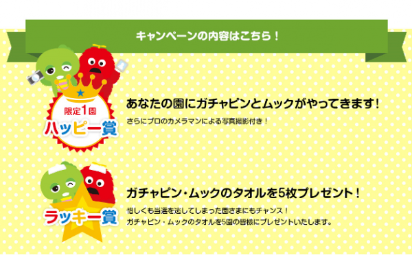 [写真]「ガチャピン・ムック」が幼稚園・保育園向け写真販売システム「園ナビフォト」にイメージキャラクターに就任。「ガチャピン・ムック」の来園キャンペーン募集開始(3/3)