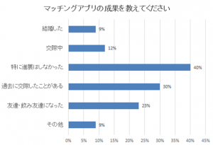 マッチングアプリで実際に会った男女にマッチングアプリでの成果を調査したところ、「結婚した」と回答したのが7%、「交際中」と回答したのが10%、「過去に交際したことがある」と回答したのが24%と、41%の男女がマッチングアプリで出会った人と交際・結婚したとの結果に。(株式会社GEARプレスリリース)
