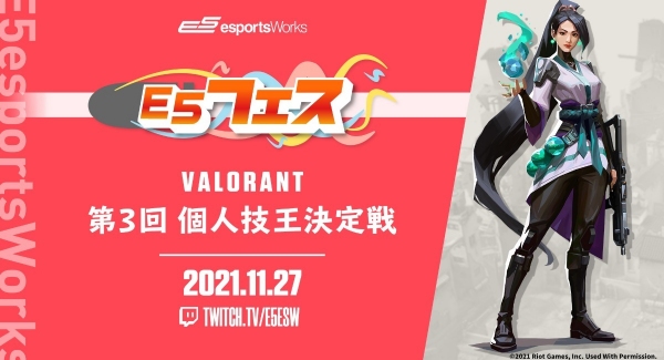 eスポーツ大会/イベントの総合演出・運営、eスポーツ施設の運営を行う 株式会社E5esports Works(本社:東京都千代田区 代表取締役 西川典孝 以下E5)は、2021年11月27日(土)に、どなたでも参加できるプロ/インフルエンサー混合の一般参加型オンラインカジュアルイベント「E5フェス VALORANT 第3回 個人技王決定戦」を開催します。(株式会社E5esports Worksプレスリリース)