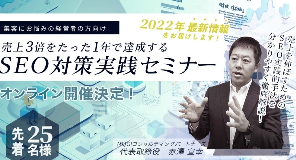 株式会社GIコンサルティングパートナーズ(本社:東京都千代田区 代表者:赤澤宣幸)は、2022年6月22日(水)に、「売上3倍をたった1年で達成する 2022年最新SEO対策実践オンラインセミナー」を開催いたします。(株式会社GIコンサルティングパートナーズプレスリリース)