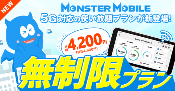 [写真]“業界最安級モバイル”Wi-Fi「MONSTER MOBILE」5G対応!データ容量【無制限プラン】の提供を開始