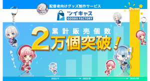 モイ株式会社(本社:東京都千代田区 代表:赤松 洋介)は、2022年11月に一般オープンした、配信者向けのグッズ制作サービス「ツイキャス グッズファクトリー」のグッズ販売個数が2万個を突破したことをお知らせします。(モイ株式会社プレスリリース)