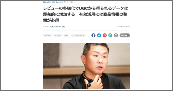セミナーレポート記事『レビューの多様化でUGCから得られるデータは爆発的に増加する 有効活用には商品情報の整備が必須』が「ECzine」に掲載 EC商品検索・レビュー・ハッシュタグ・OMOソリューションを開発販売するコマースとCXのリーディングカンパニーであるZETA株式会社(本社:東京都世田谷区、以下ZETA)は、2023年6月14日(水)にオンラインで開催されたEC向けマーケティングイベント『ECzine Day 2023 Summer』にて「UGCで爆発的に増えるコマースのデータ 今こそ必要な商品情報整備の考え方とは?」と題したセミナーに登壇し、その様子がセミナーレポートとして公開されました。(ZETA株式会社プレスリリース)