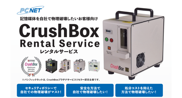 株式会社パシフィックネット(本社:東京都港区、代表取締役社長:上田 満弘、以下 当社)は、使用済み IT 機器の記憶媒体の物理破壊を自社で行いたいお客様向けに、株式会社日東ホルカム製の記憶媒体破壊装置「CrushBoxシリーズ」を貸し出す「CrushBoxレンタルサービス」(以下 本サービス)の提供を開始いたします。(株式会社パシフィックネットプレスリリース)