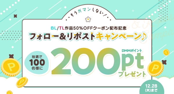 株式会社デジタルコマース(東京都港区、代表取締役社長 島崎 啓之)が展開する二次元コンテンツのダウンロード販売サービス『FANZA同人』は、2023年12月14日(木)00:00から2024年1月31日(水)23:59まで、BL・TL/乙女向け作品に使用できる50%OFFクーポンをはじめ、お得に作品が楽しめるキャンペーンを実施します。(株式会社デジタルコマースプレスリリース)