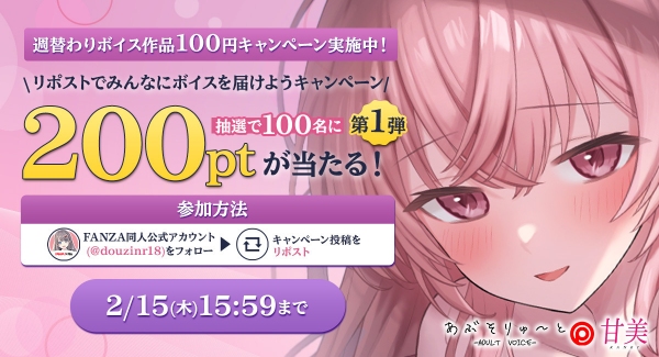 株式会社デジタルコマース(東京都港区、代表取締役社長 島崎 啓之)が展開する二次元コンテンツのダウンロード販売サービス『FANZA同人』は、2024年2月8 日(木)から2月22日(木)まで、音声サークル「あぶそりゅ〜と」と「甘美」の一部作品が100円で購入できるキャンペーンを実施いたします。(株式会社デジタルコマースプレスリリース)