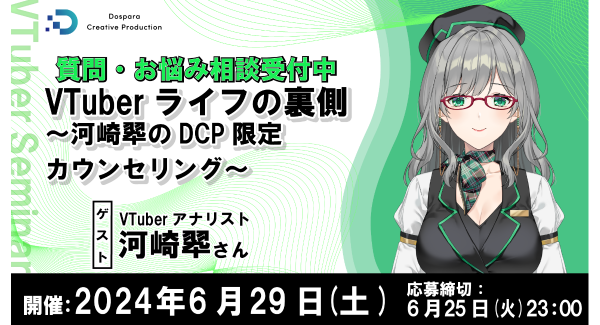 パソコン専門店ドスパラは、『VTuberライフの裏側~河崎翆のDCP限定カウンセリング~』を、2024年6月29日(土)20時よりオンラインで開催します。(株式会社サードウェーブプレスリリース)